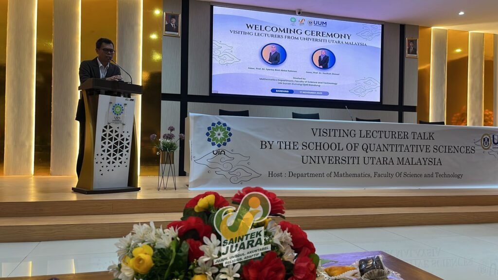 Bandung, 17 November 2025— Jurusan Matematika Fakultas Sains dan Teknologi (FST) UIN Sunan Gunung Djati Bandung menyelenggarakan kegiatan Visiting Lecturer Talk dengan menghadirkan dua pemateri dari School of Quantitative Sciences (SQS), Universiti Utara Malaysia (UUM), yaitu Assoc. Prof. Dr. Syariza binti Abdul Rahman dan Assoc. Prof. Nazihah Ahmad. Acara pembukaan berlangsung di Aula Fakultas Syariah dan Hukum.
