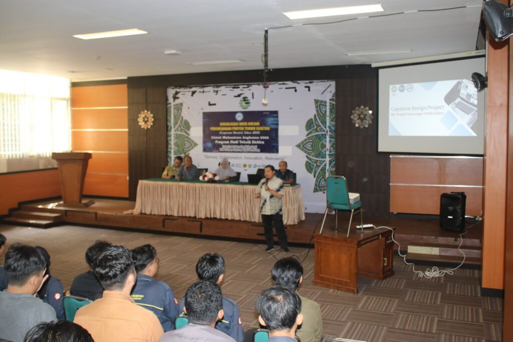 Dalam sambutannya, Ketua Jurusan Teknik Elektro, Eki Ahmad Zaki Hamidi, MT., menegaskan bahwa Capstone Design merupakan mata kuliah baru pada Kurikulum 2025 yang bersifat wajib. “Mata kuliah ini didesain untuk menghasilkan karya inovatif sebagai bentuk implementasi keilmuan yang telah dipelajari mahasiswa, sehingga dapat menjawab tantangan nyata di masyarakat maupun industri,” ujarnya.